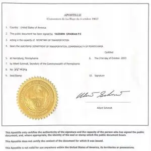 A Pennsylvania Apostille is a certificate that is affixed by the Pennsylvania Secretary of State to a public document. It certifies the authenticity of the signature appearing on the document as that of an authorized Pennsylvania public official and confirms the capacity of that official (e.g. State Registrar, notary public).
